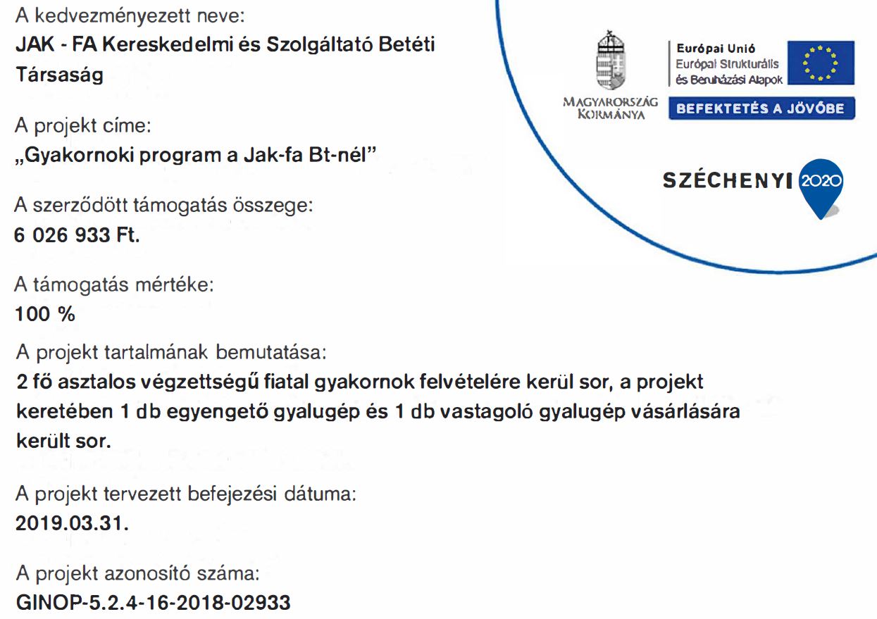 A projekt keretein belül 2 fő asztalos (OKJ34 543 02) végzettségű fiatal gyakornok felvételére kerül sor, a gyakornoki helyek kialakítása érdekében eszköz beszerzésre is sor került, a megfelelő munkafolyamatok elvégzése érdekében 1 db egyengető gyalugép és 1 db vastagoló gyalugép vásárlására került sor. Gyakornokként a felvételre kerülő fiatalok valódi munkatapasztalatot szereztek, gyakornoki kapcsolattartó foglalkozott velük, aki szakmai tapasztalatainak köszönhetően hozzájárult a gyakornok szakmai előmenetelének fejlesztésében, az önálló munkavégzés képességének elsajátításához, ezáltal javult hosszabb távon a munkaerő-piaci esélyeik. A tapasztalatok megszerzése az általános bútorasztalosi szakmára vonatkozik és egyéb faipari feladatok ellátására.